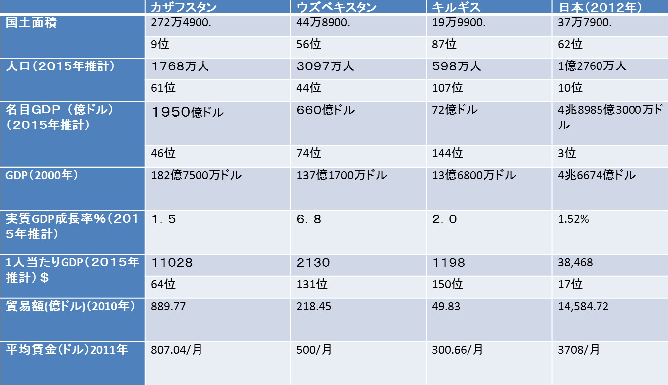 経済としてはウズベキスタン、カザフスタンは石油、天然ガス、ウランと言ったエネルギー資源、さらにキルギスは金、銀、銅、レアメタルなどの鉱物資源に恵まれており、産業構造としては少なからず原料依存型である。