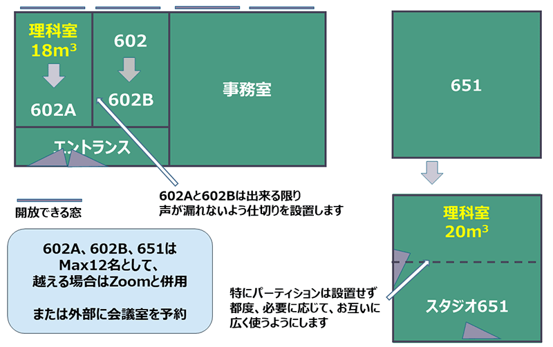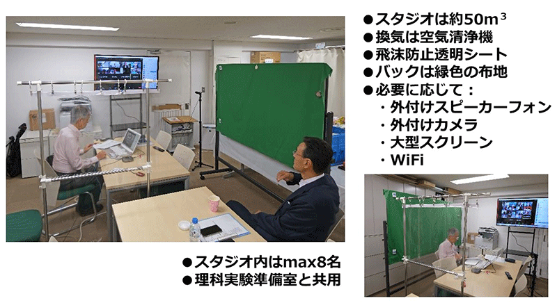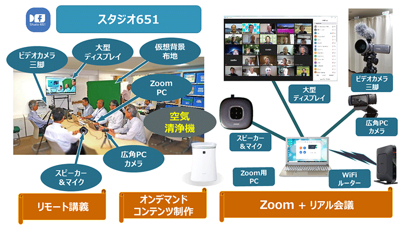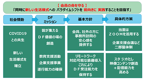 DF事務局では、まず、昨年3月(2020)の早い段階から、リモートワークなどの新しい生活様式を先読みした事務局長の提案を受けて、段谷プロジェクトリーダー(当時)のもと会員のリモート交流を推進するため、会議室をスタジオに改装し、PC、ディスプレイ、スピーカーマイク、ビデオカメラ、空気清浄機などのインフラを整備し、リモート会議を想定したZoomソフトの活用を会員に推奨した。