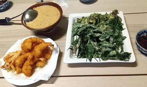 小学生が居るので献立は子供にも喜ばれやすい揚げ物に偏りがちで、”鳥の唐揚げ”が一番多いかもしれません。写真は先の連休中に長野で買ってきた山菜で、タラの芽と山うどの”天ぷら”、加えて”エビフライ”の揚げ物コンビです(エビの殻剥きは指先に怪我をしやすいので要注意)。