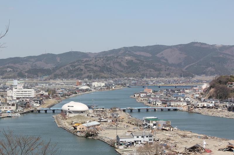 写真2は、東日本大震災時の宮城県石巻市内の河川流域における被害状況である。中央よりやや左下にシェルと思われる建物をご覧いただけるだろう。これは、地震動により多くの建物が崩壊した後に津波が押し寄せて殆どの建物が流された中で、ちゃんと立っている稀有な建物である。建物の室内は1mくらい浸水したようであるが、建物全体としての被害はさほど大きくはなかったようである。シェルが地震や津波に強い実例の一つといえよう。
