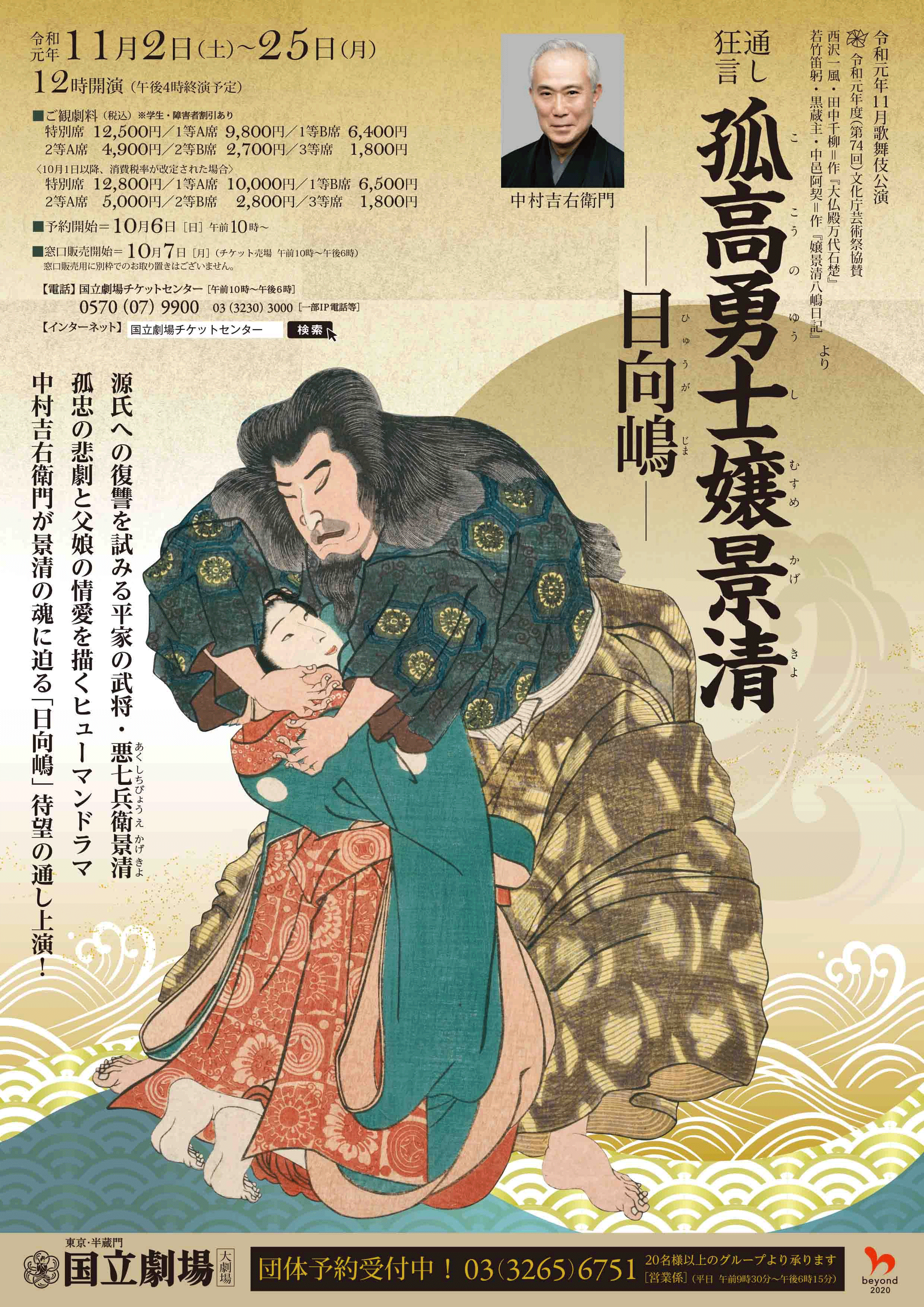 大仏開眼供養の場に現れた景清は目指す頼朝の襲撃に失敗し、その忠義を讃え、鎌倉への仕官を勧める頼朝の好意を振り切り、自らの両眼をくりぬき、主君平重盛の位牌とともに漂白の旅に出ます。景清の娘、糸滝はまだ会ったことの無い父親が、日向の地で漂泊の身にあることを知り、父の仕官の資にすべく、自ら廓に身を売り、廓の主人やリクルーターの人情に助けられ日向に向かいます。巡り合った父は、一旦は親子の名乗りを拒絶しますが、娘の真情を知り、鎌倉への帰還を決意します。帰還の大舟の舳先にたった景清は、彼を孤高たらしめていた重盛の位牌を大海に沈めます。景清の回心と再生を象徴する所作ですが、江戸時代にこのような巧みな演出を作り出した歌舞伎に感嘆します。